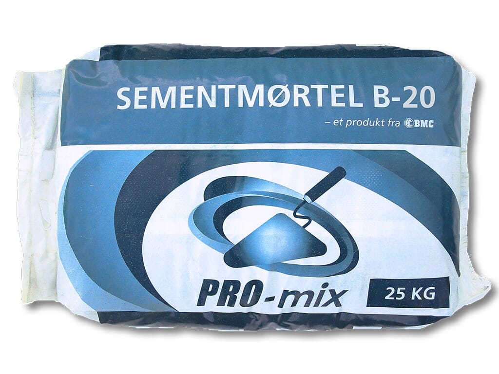 PRO-mix B-20 er støpemørtel som kun tilsettes vann og blandes opp. Benyttes til støpearbeider inne- og utvendig. Generell informasjon om mørtel til både støping og muring/pussing: Blandes med rent ferskvann. I vinterhalvåret må det også tilsettes frost-hindrende middel. Små mengder kan blandes for hånd eller med drill. For større jobber anbefales tvangsblander eller vanlig blandemaskin. Sugende underlag skal forvannes og eventuelt primes for å få vedheft. Etterbehandling: Mørtelen må beskyttes mot for tidlig uttørking ved hjelp av tildekning og vanning. Dette er spesielt viktig i sommerhalvåret og gjelder for alle produkter. Leveres i plastsekk som forlenger holdbarheten og minsker svinn under byggeperioden.
