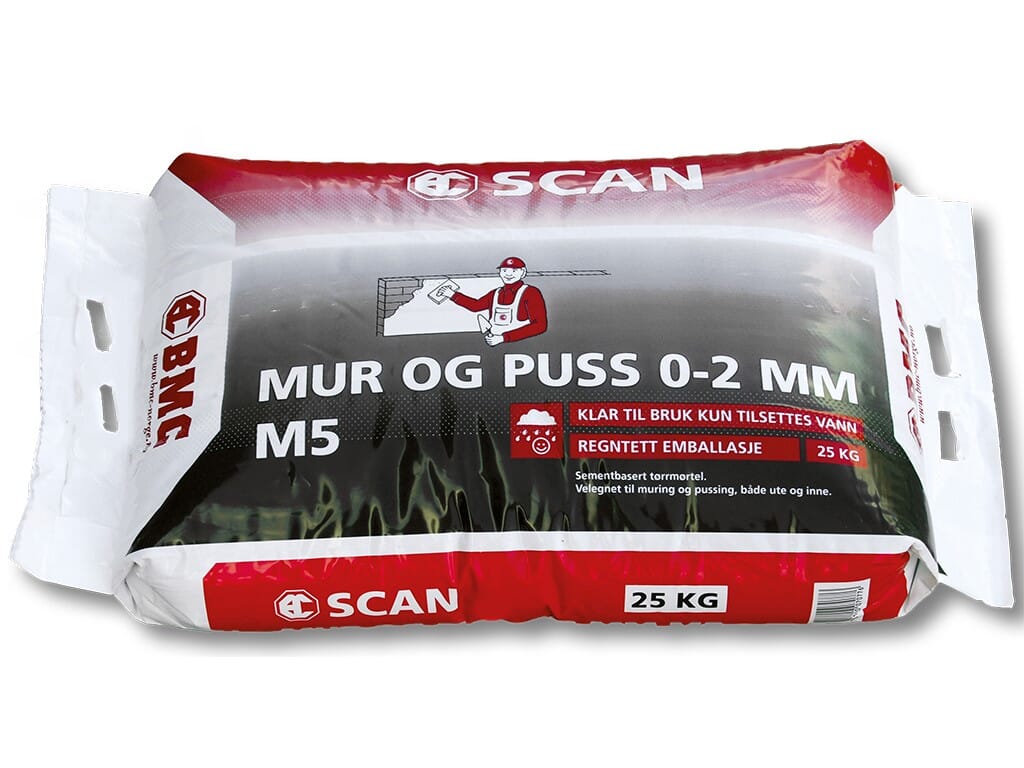 Scan Mur og Puss M5 mørtel har i en årrekke vært proffen`s førstevalg når det kommer til mur og puss mørtel. Den har en perfekt korning og smidiget som gjør pussjobben raskere og enklere å utføre. Leveres som standard i farge grå, men kan også leveres i en rekke ulike farger på bestilling. Generell informasjon om mørtel til både støping og muring/pussing: Blandes med rent ferskvann. I vinterhalvåret må det også tilsettes frost-hindrende middel. Små mengder kan blandes for hånd eller med drill. For større jobber anbefales tvangsblander eller vanlig blandemaskin. Sugende underlag skal forvannes og eventuelt primes for å få vedheft. Etterbehandling: Mørtelen må beskyttes mot for tidlig uttørking ved hjelp av tildekning og vanning. Dette er spesielt viktig i sommerhalvåret og gjelder for alle produkter. Leveres i plastsekk som forlenger holdbarheten og minsker svinn under byggeperioden.